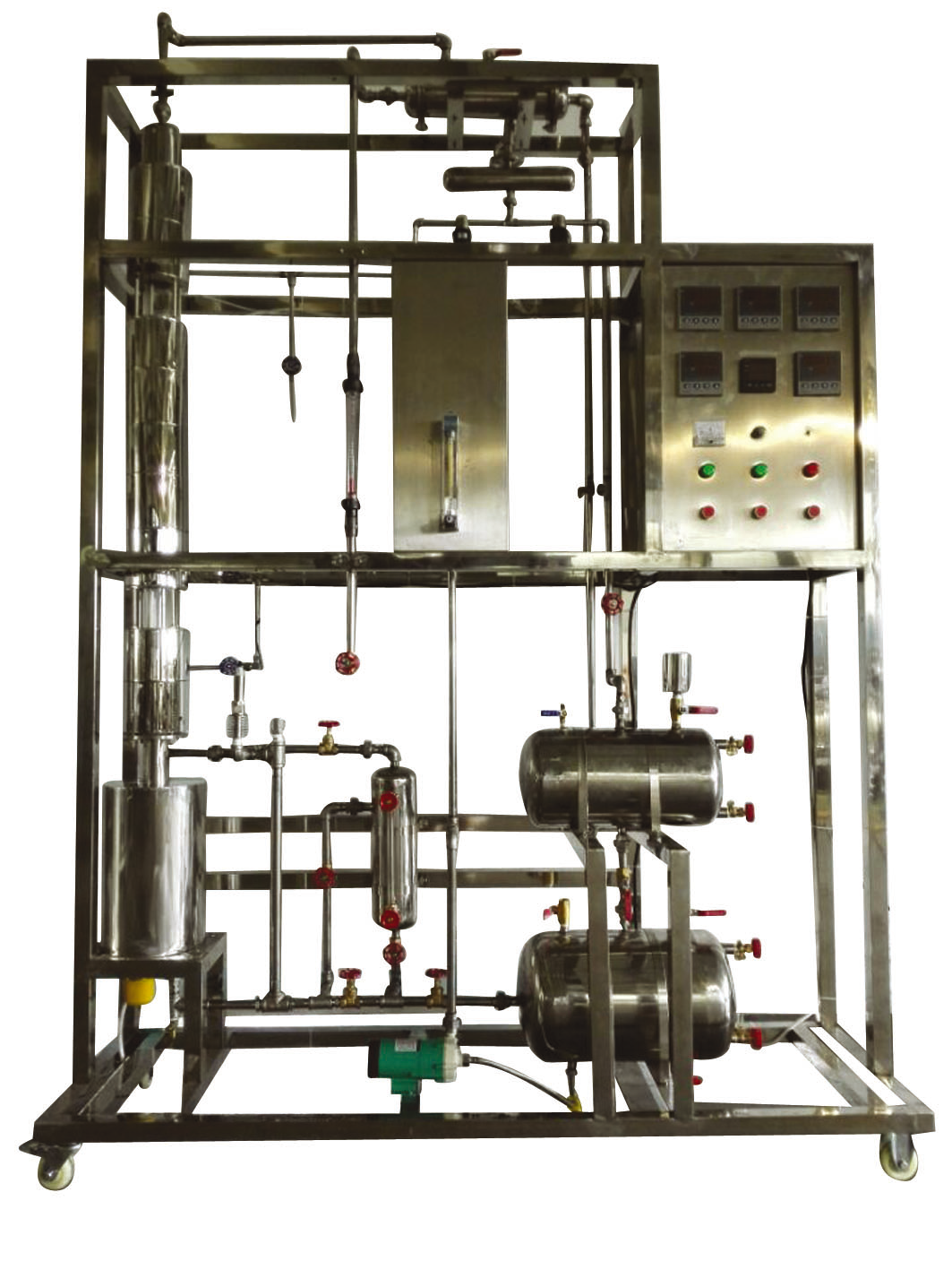 304 不銹鋼塔體(篩板):φ 57 × 10 00mm (篩板 數 10 塊 ), 可拆卸, 板間距 100mm, 開孔率 6%, 單溢流降液管 , 高硼硅 玻璃塔段兩個:φ 60 × 100mm 。