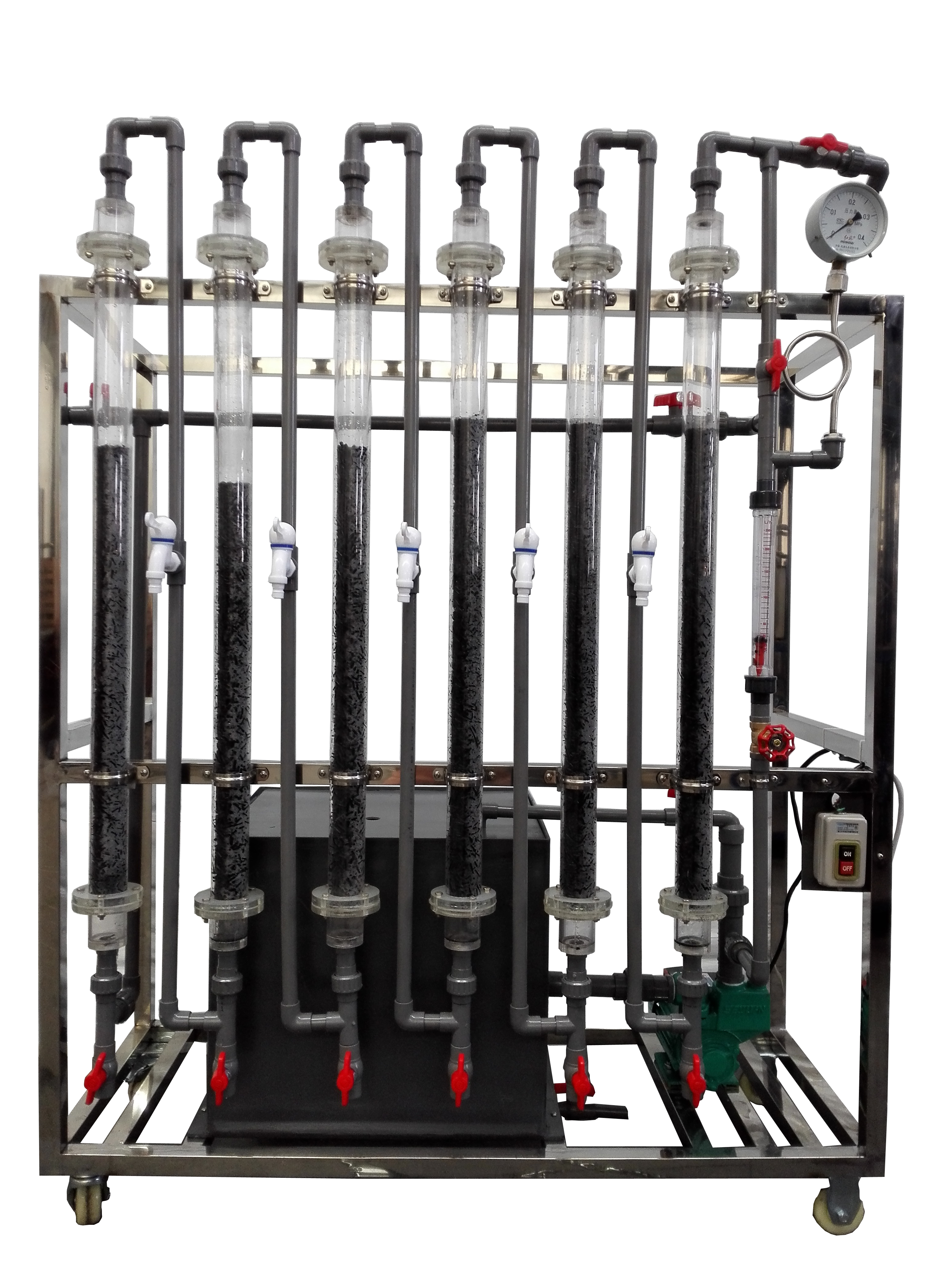 吸附柱、活性炭、水泵、水箱、液體流量計(jì)、壓力表、反洗系統(tǒng)、不銹鋼框架、控制屏。