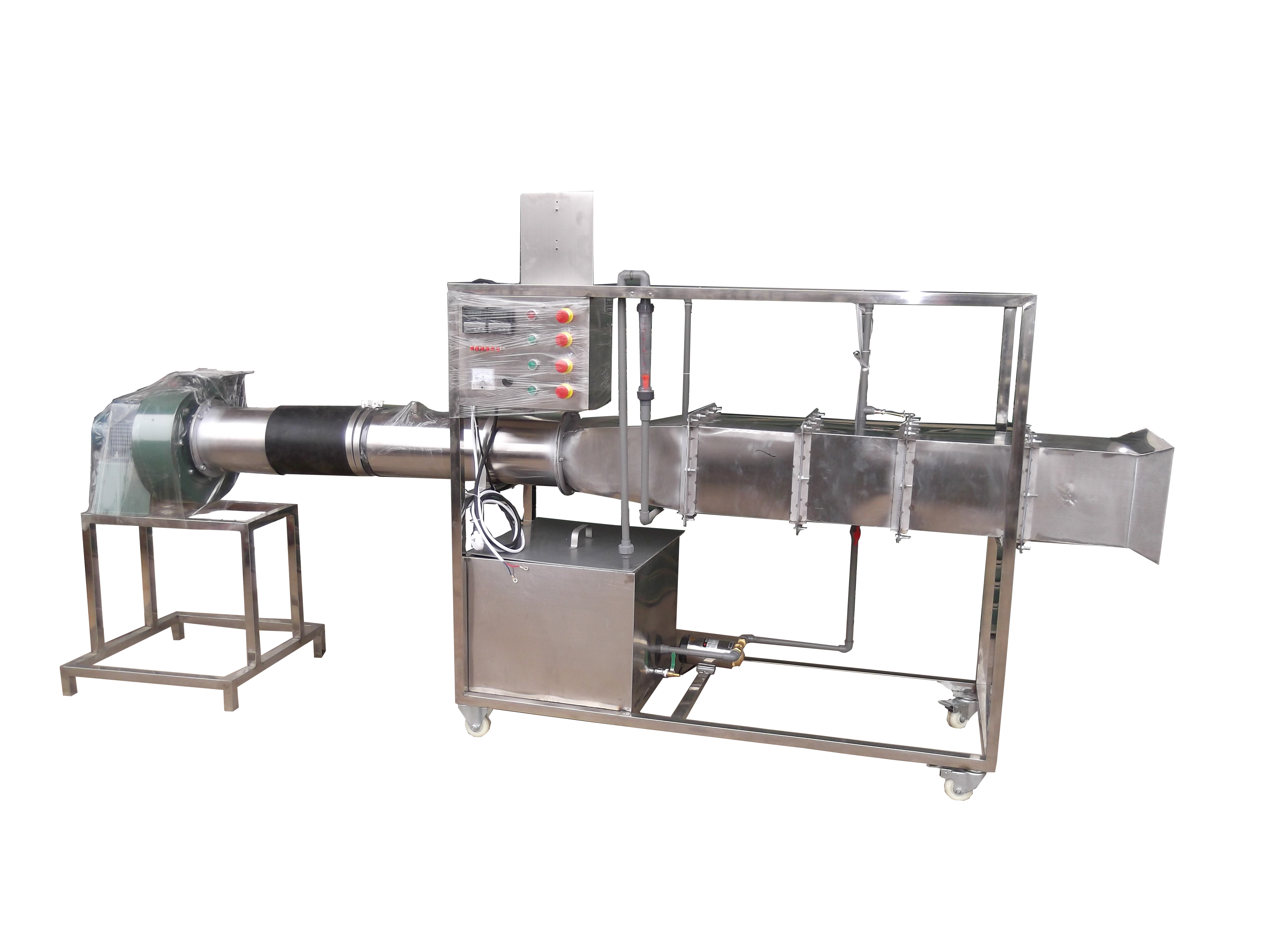 循環(huán)防腐水泵,轉(zhuǎn)子流量計(jì)、風(fēng)冷冷凝器,翅片管式換熱器,風(fēng)洞實(shí)驗(yàn)段,多翼式低噪音離心風(fēng)機(jī),自動(dòng)調(diào)節(jié)風(fēng)門,笛形管及差壓測風(fēng)速裝置,加熱由 固體調(diào)壓模塊無級調(diào)節(jié), 控制測試儀表箱,不銹鋼加熱水箱, 8路萬能信號輸入巡檢儀顯示溫度、水和風(fēng)的阻力及風(fēng)速。