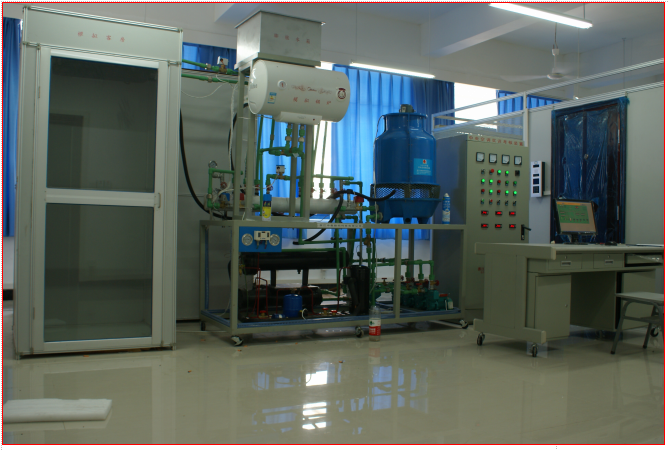 由壓縮機(jī)、螺旋式冷凝器、螺旋式蒸發(fā)器、儲液罐、熱力膨脹閥、視液鏡、干燥過濾器等組成,管路中還設(shè)有控制閥等實訓(xùn)所必需的部件,管路中視液鏡可觀察制冷劑狀態(tài)等設(shè)備組成。制冷機(jī)組主要完成制冷工作,制冷劑為 R22 。