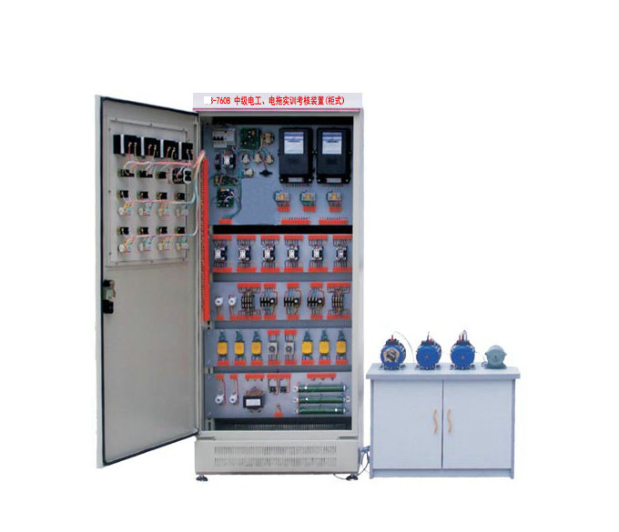 中級電工 . 電拖實訓(xùn)考核裝置按標(biāo)準(zhǔn)電氣控制柜設(shè)計制造規(guī)格,充分利用雙面位置,電工電拖考核柜柜內(nèi)裝有完成各種照明電路所需的單相電度表、日光燈、單聯(lián)開關(guān)、插座、感應(yīng)開關(guān)、漏電開關(guān)等,以及電氣控制所需要的多種低壓電器,如漏電斷路器、熔斷器、電流互感器、交流接觸器、時間繼電器、熱繼電器、中間繼電器、行程開關(guān)、按鈕、信號燈、轉(zhuǎn)換開關(guān)、電壓表、電流表、功率表及電度表等,為了延長電器使用壽命,各電器的接點都與接線端子相連,再由接線端子與被控制電氣連接。