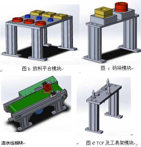 ( 4 ) . 物料儲存在碼垛模塊,由機器人將物料分揀至分揀料盤,分揀好的產(chǎn)品 有機器人再次 送回碼垛模塊,完成整個循環(huán)。