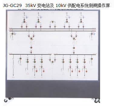 “JG-GC29 35kV 變電站及 10kV 供配電系統(tǒng)倒閘操作屏 ” 是針對(duì)變電站倒閘操作而專門(mén)研制的實(shí)訓(xùn)裝置。本系統(tǒng)含 35kV 、 10kV 和 0.4kV 三個(gè)電壓等級(jí): 35kV 具有 4 路進(jìn)線,雙母帶聯(lián)絡(luò); 10kV 側(cè)采用單母分段,兩入兩出,環(huán)網(wǎng)供電; 0.4kV 側(cè)采用單母分段,并具有備用發(fā)電系統(tǒng)。在此典型 35kV 變電站模型上,學(xué)生可以進(jìn)行各種工況下的倒閘操作。變電站的電壓等級(jí)和結(jié)線方式也可以根據(jù)用戶要求設(shè)計(jì)。因此本裝置適合各類職業(yè)院校供配電類、電力公司、職業(yè)技能培訓(xùn)部門(mén)等機(jī)構(gòu)的培訓(xùn)、考核。