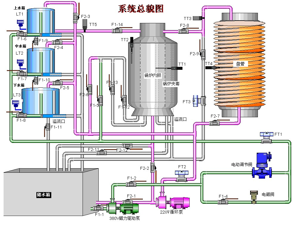 實驗對象系統(tǒng)包含有:不銹鋼儲水箱;上、中、下三個串接有機玻璃圓筒型水箱;三相4.5kW電加熱鍋爐(由不銹鋼鍋爐內(nèi)膽加溫筒和封閉式外循環(huán)不銹鋼冷卻鍋爐夾套構(gòu)成)和鋁塑盤管組成。
