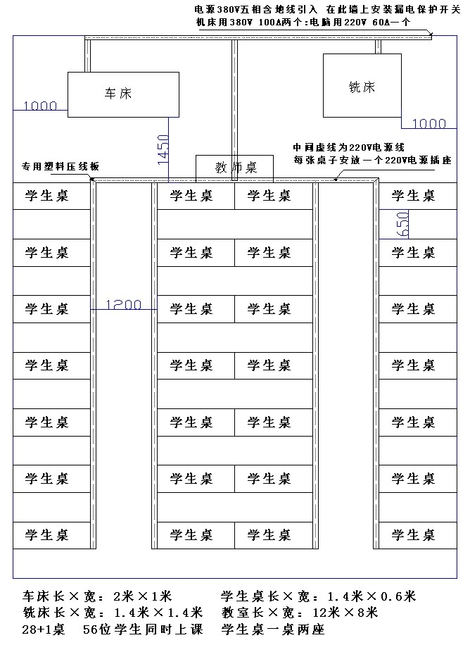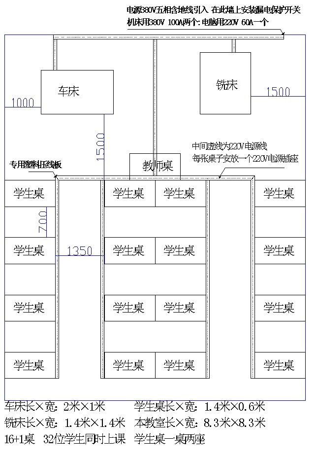 注:5、學(xué)校負(fù)責(zé)提供標(biāo)準(zhǔn)尺寸教室一間,并引入380V動力和220V普通電源。