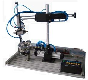 該機(jī)械手模型采用臺式結(jié)構(gòu),由氣動組立機(jī)械手、旋轉(zhuǎn)式供料盤、接料盤、操作面板等組成,并配有控制器(PLC)、傳感器(光電式、電磁式)、步進(jìn)電機(jī)、操作按鈕、電磁閥、減壓閥等,構(gòu)成典型的機(jī)電一體化教學(xué)模型。涵蓋了PLC控制、位置控制、氣動控制、檢測等多種技術(shù)。本裝置的控制面板采用了按鍵控制。