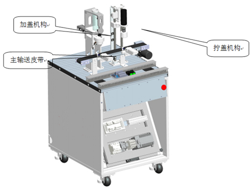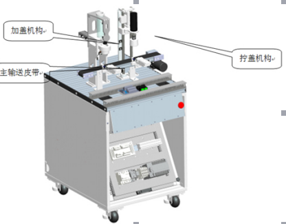 接收上一工作站填裝好顆粒的瓶子,當(dāng)瓶子被輸送到加蓋機(jī)構(gòu)后,主輸送皮帶停止,夾蓋定位夾緊機(jī)構(gòu)將瓶子固定,加蓋機(jī)構(gòu)啟動(dòng)加蓋流程,將蓋子加到瓶子上;加好蓋子后主輸送皮帶啟動(dòng),加上蓋子的瓶子繼續(xù)被送往擰蓋機(jī)構(gòu),到擰蓋機(jī)構(gòu)下方,主輸送皮帶停止,擰蓋定位夾緊機(jī)構(gòu)將瓶子固定,擰蓋機(jī)構(gòu)啟動(dòng),將瓶蓋擰緊,主輸送皮帶啟動(dòng),將擰好蓋子的物料瓶輸送到下一工位。瓶蓋分為白色和黑色兩種。
