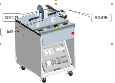 主皮帶運(yùn)行,接收上一站擰好蓋后的物料瓶子,當(dāng)物料瓶經(jīng)過(guò)檢測(cè)機(jī)構(gòu)時(shí):回歸反射傳感器檢測(cè)瓶蓋是否擰緊;檢測(cè)機(jī)構(gòu)檢測(cè)瓶子內(nèi)部顆粒是否符合要求;對(duì)擰蓋與顆粒均合格的瓶子進(jìn)行瓶蓋顏色判別區(qū)分;擰蓋或顆粒不合格的瓶子被分揀機(jī)構(gòu)推送到廢品皮帶上(短皮帶);擰蓋與顆粒均合格的瓶子被輸送到皮帶末端,等待機(jī)器人搬運(yùn)。