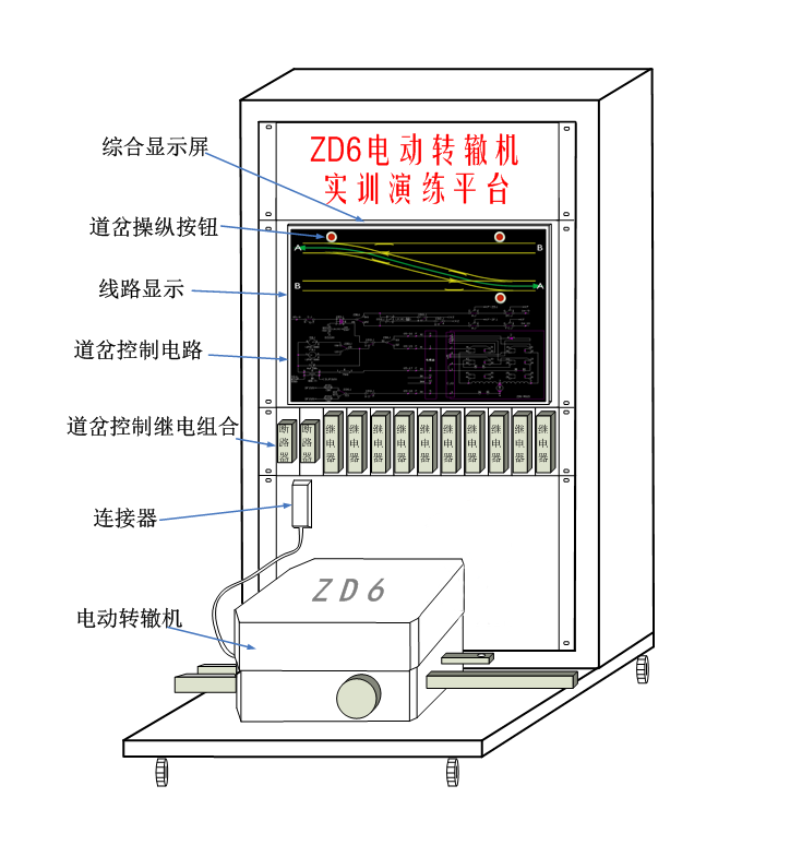 ZD6轉(zhuǎn)轍機(jī)實(shí)訓(xùn)演練平臺(tái)由信號(hào)組合柜、道岔控制組合板、信號(hào)繼電器、ZD6電動(dòng)轉(zhuǎn)轍機(jī)、線路及控制電路狀態(tài)顯示計(jì)算機(jī)、顯示屏、多路數(shù)字量驅(qū)動(dòng)采集模塊、24V電源模塊、直流220V道岔動(dòng)作電源、斷路器、練功平臺(tái)車等設(shè)備組成。設(shè)備外觀結(jié)構(gòu)如下圖所示。