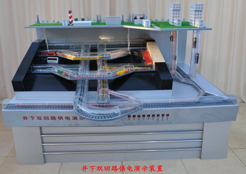 該現(xiàn)代化礦井雙回路供電系統(tǒng)演示裝置通過模擬線路演示:區(qū)域網(wǎng)到地面變電所,礦發(fā)電廠到地面變電所的供電線路。再通過光電系統(tǒng)演示:地面變電所向井下中央變電所實行雙回路供電,中央變電所向水泵房直接供電,采區(qū)變電所由中央變電所實行雙回路供電;夭晒ぷ髅婧途蜻M工作面的電氣設(shè)備分別由采區(qū)變電所供電。