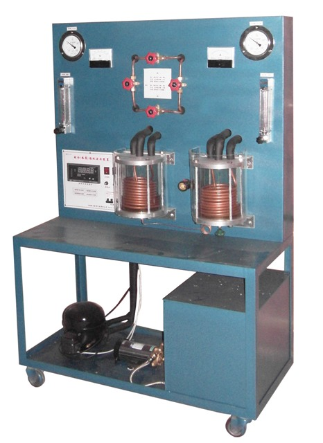 主要配置:由壓縮機(jī)、冷凝器、壓力真空表、蒸發(fā)器、流量計、水泵、電壓表、測溫系統(tǒng)、電流表、水箱、配電控制箱、有機(jī)玻璃防護(hù)罩、控制閥門、8路溫度巡檢儀。