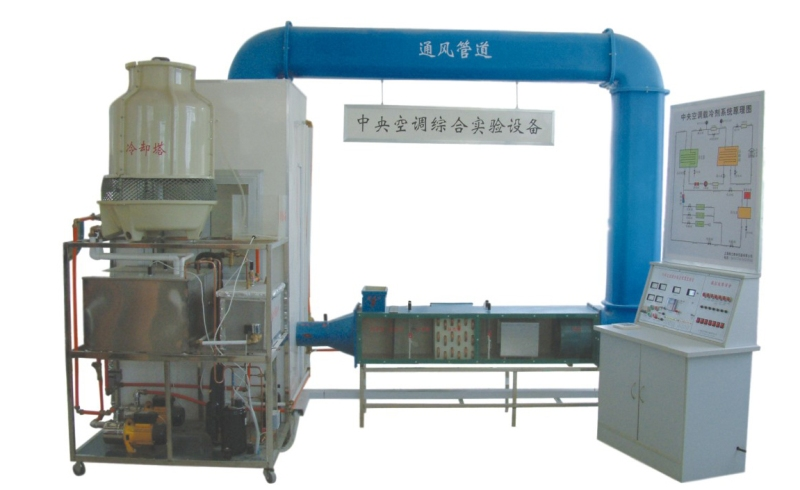 主要配置:控制臺(tái)及運(yùn)行工況演示板,空調(diào)間排風(fēng)模擬房,送風(fēng)管,空氣熱濕處理段,蒸發(fā)器、冷凝器及水箱,冷卻塔、冷卻水泵、冷卻塔風(fēng)機(jī)組成的冷卻水系統(tǒng),由制冷壓縮機(jī)、壓力表、高低壓保護(hù)開關(guān)、冷凝器、儲(chǔ)液罐、電磁閥、液視鏡、膨脹閥及毛細(xì)管、蒸發(fā)器等組成制冷系統(tǒng)。由電熱鍋爐、流量計(jì)、散熱器(表冷器)、膨脹水箱、循環(huán)水泵等組成供熱系統(tǒng)。
