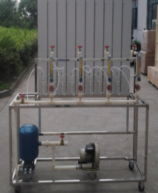 不銹鋼實(shí)驗(yàn)臺(tái)、旋渦氣泵、穩(wěn)壓罐、供氣干管、用戶支管、用戶流量計(jì)、壓差板、單管壓力計(jì)等組成。氣泵工作產(chǎn)生的氣流進(jìn)入穩(wěn)壓罐,經(jīng)瀉流穩(wěn)壓后,供給模擬的燃?xì)庥脩,每個(gè)用戶由支管、流量計(jì)和尾閥組成,在壓差板上設(shè)有9只單管壓力計(jì),可分別測量干管起點(diǎn)的壓力、用戶支管及包含燃具的阻抗在內(nèi)的壓差,而第9只壓力計(jì)則既測量最終用戶的阻抗,又是干管的終點(diǎn)壓力。通過調(diào)整瀉流閥、用戶流量及尾閥進(jìn)行實(shí)驗(yàn)。