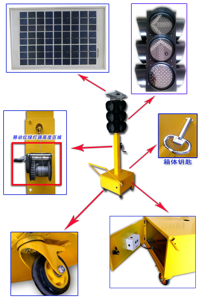 太陽能移動(dòng)紅綠燈由LED紅綠燈、立桿及螺絲一套、移動(dòng)推車車和配件一套、太陽能電池板 、蓄電池、交通信號控制機(jī)等組成,燈色由紅、黃、綠三種構(gòu)成。