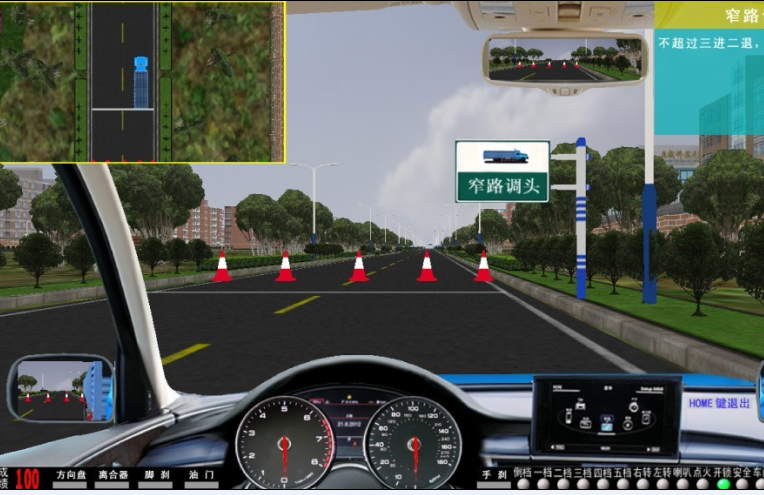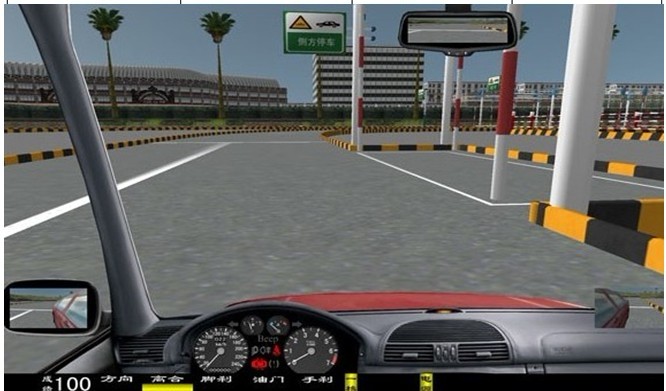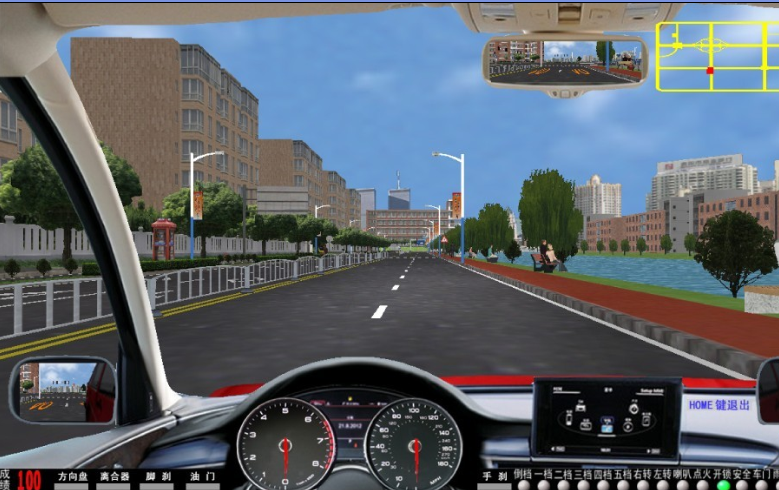 3、 軟件主界面 :?jiǎn)?dòng)畫(huà)面后, 界面下方同時(shí)顯示:油門(mén)、剎車(chē)、轉(zhuǎn)向、離合器 深淺進(jìn)度均有顯示 。 視景 120 度全新廣角寬頻駕駛模擬,界面顯示 各項(xiàng)指示燈、文字提示框、檔位位置 、訓(xùn)練成績(jī),后視鏡(左、右、中)后視鏡可調(diào)節(jié)、訓(xùn)練線路圖均有顯示。
