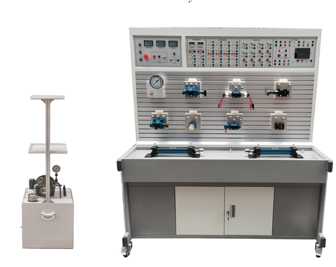 模塊、控制按鈕模塊、時間繼電器模塊、液壓泵站、液壓元件、氣泵、氣動元件等組成。